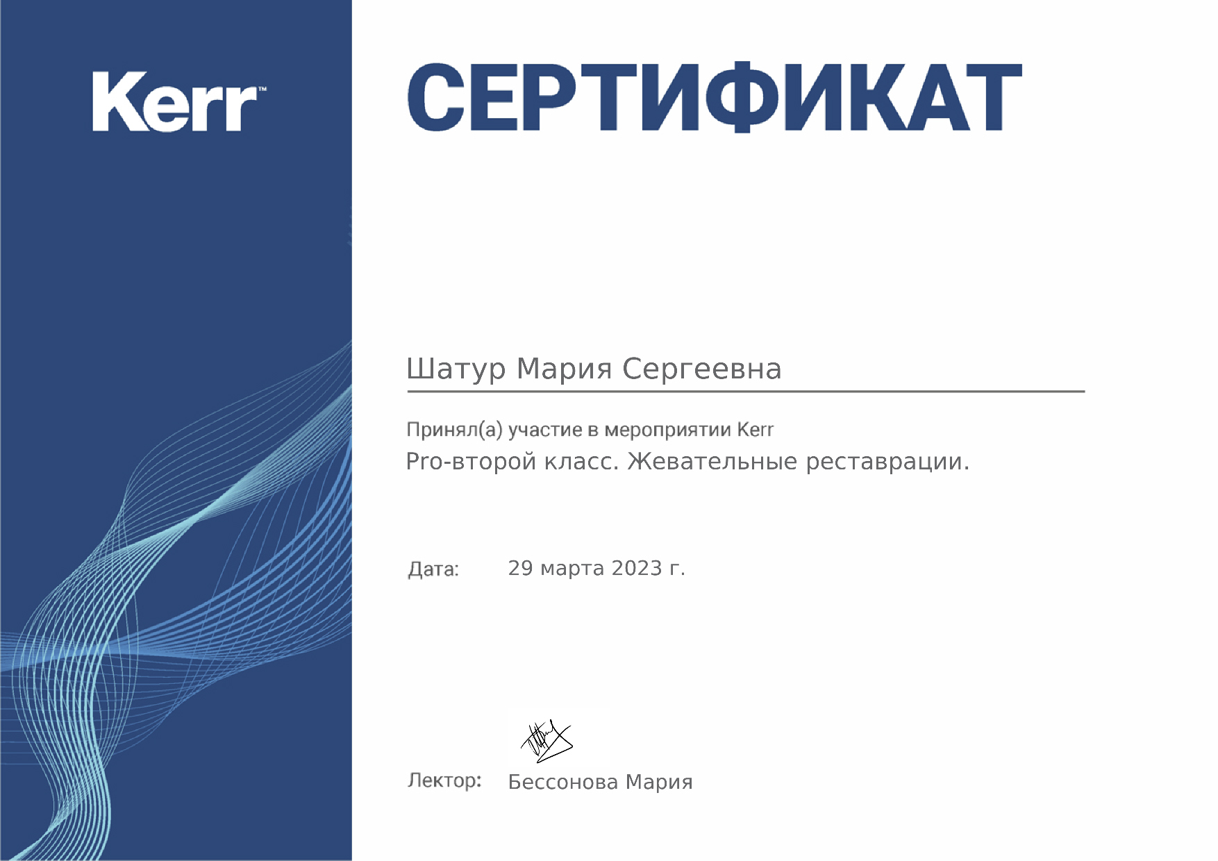 - KERR. Бессонова Мария. Семинар «PRO-второй класс. Жевательные реставрации», 2023