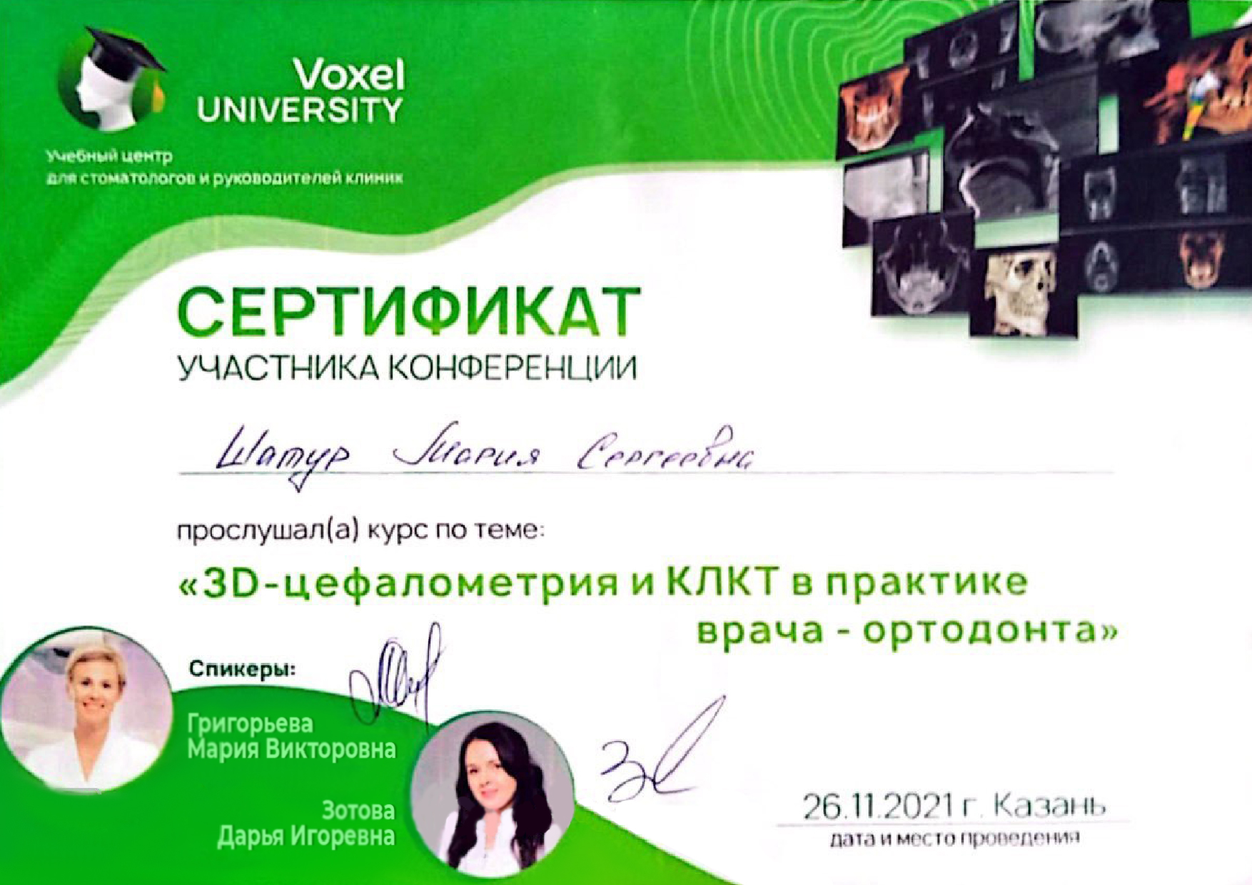 - Voxel University. Григорьева М.В., Зотова Д.И. Курс «3D-цефалометрия и КЛКТ в практике врача ортодонта», Казань, 2021