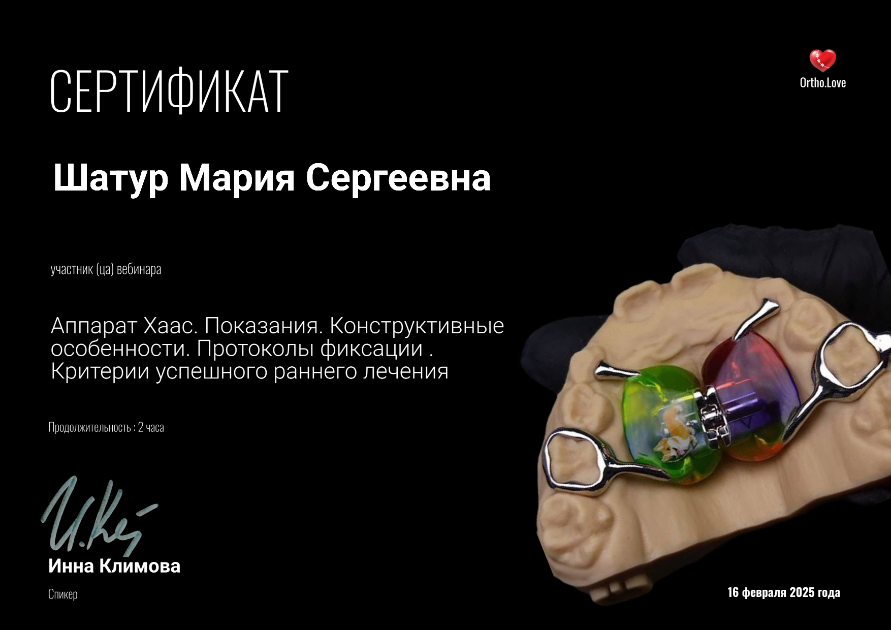 - Инна Климова. Вебинар «Аппарат Хаас. Показания. Конструктивные особенности. Протоколы фиксации. Критерии успешного лечения., 2025