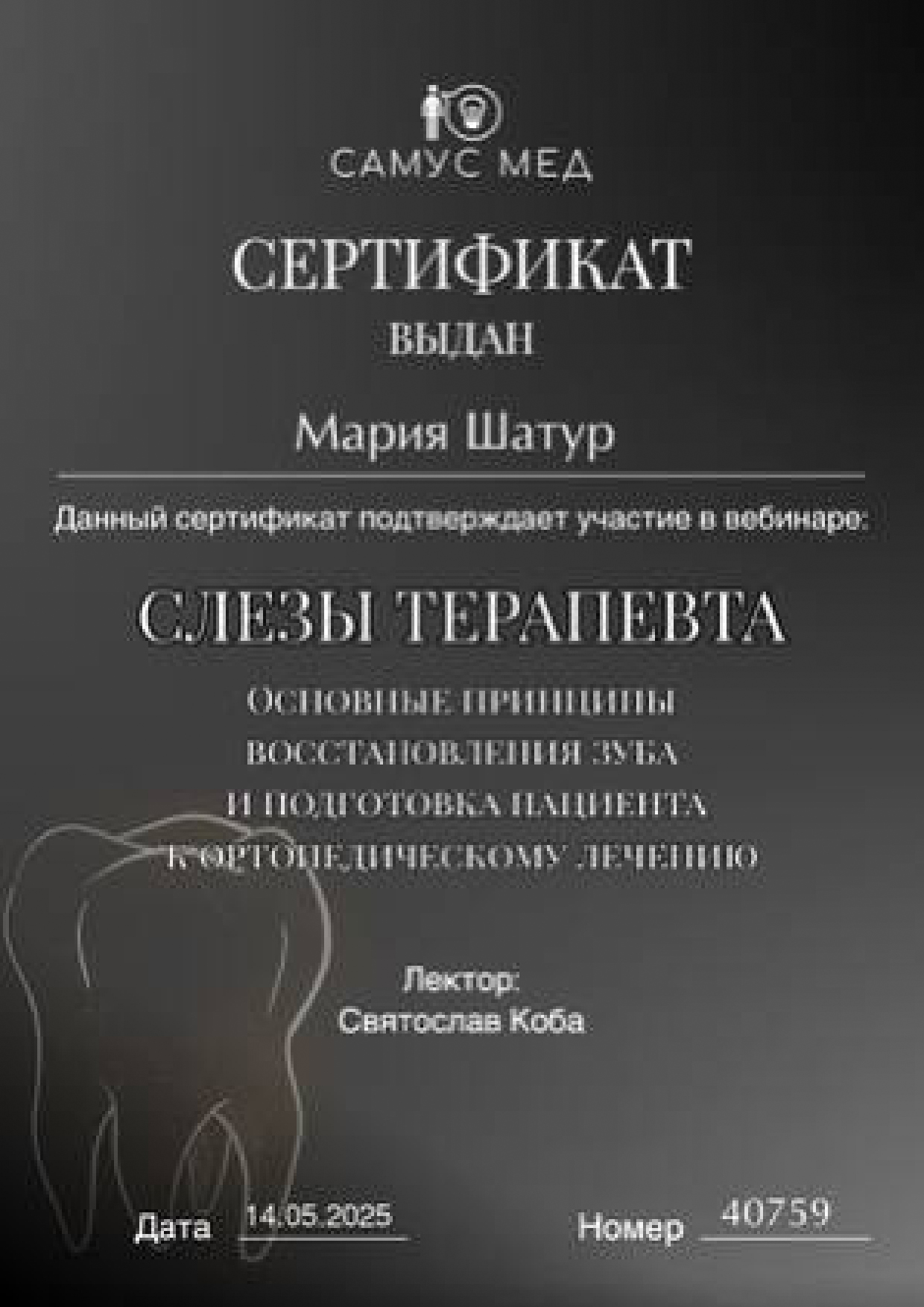 - Самус Мед. Святослав Коба. Вебинар «Слезы терапевта. Основные причины восстановления зуба и подготовка пациентак ортопедическому лечению.», 2025