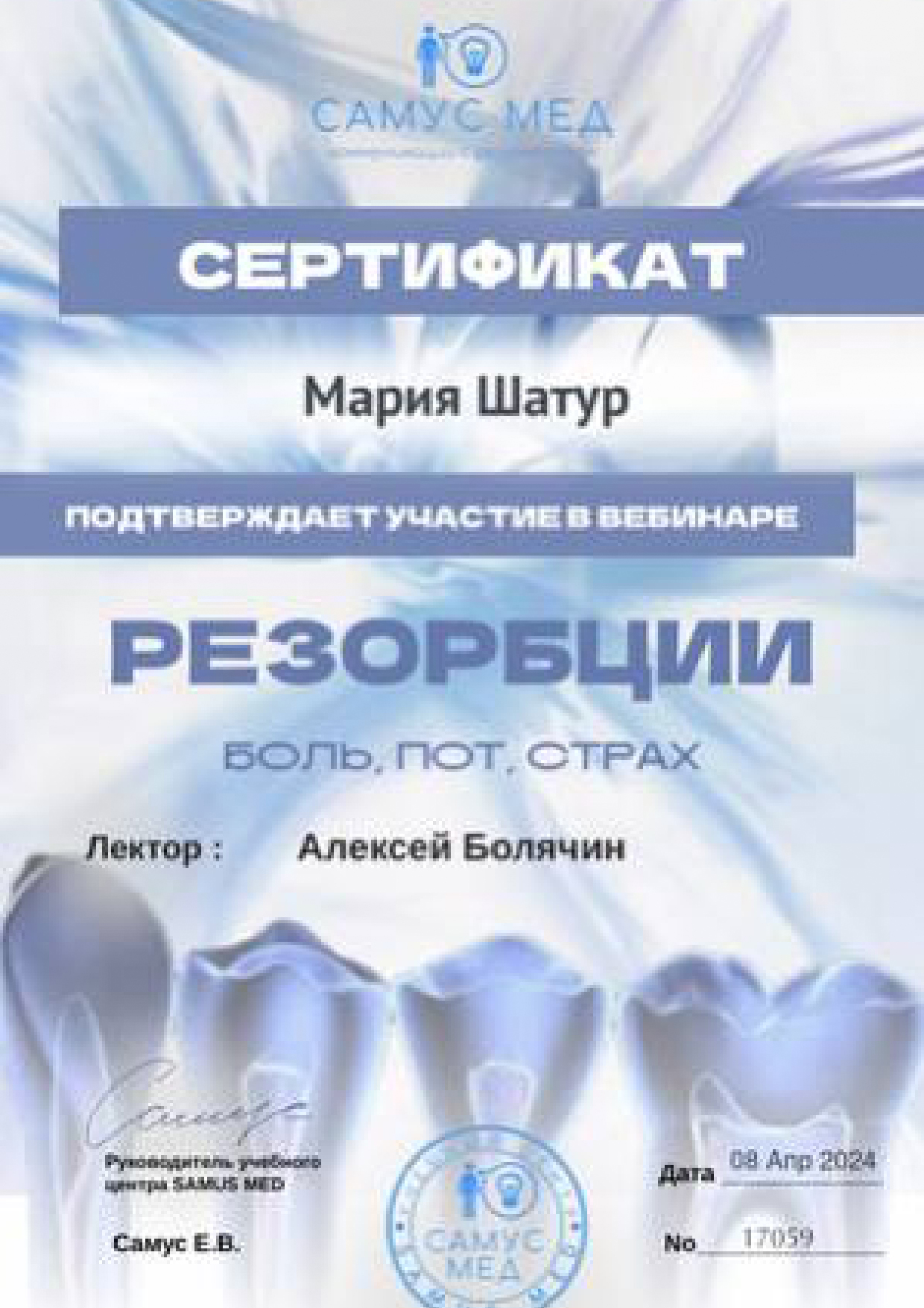 - Самус Мед. Алексей Болячин. Вебинар «Резорбции: боль, пот и страх», 2024