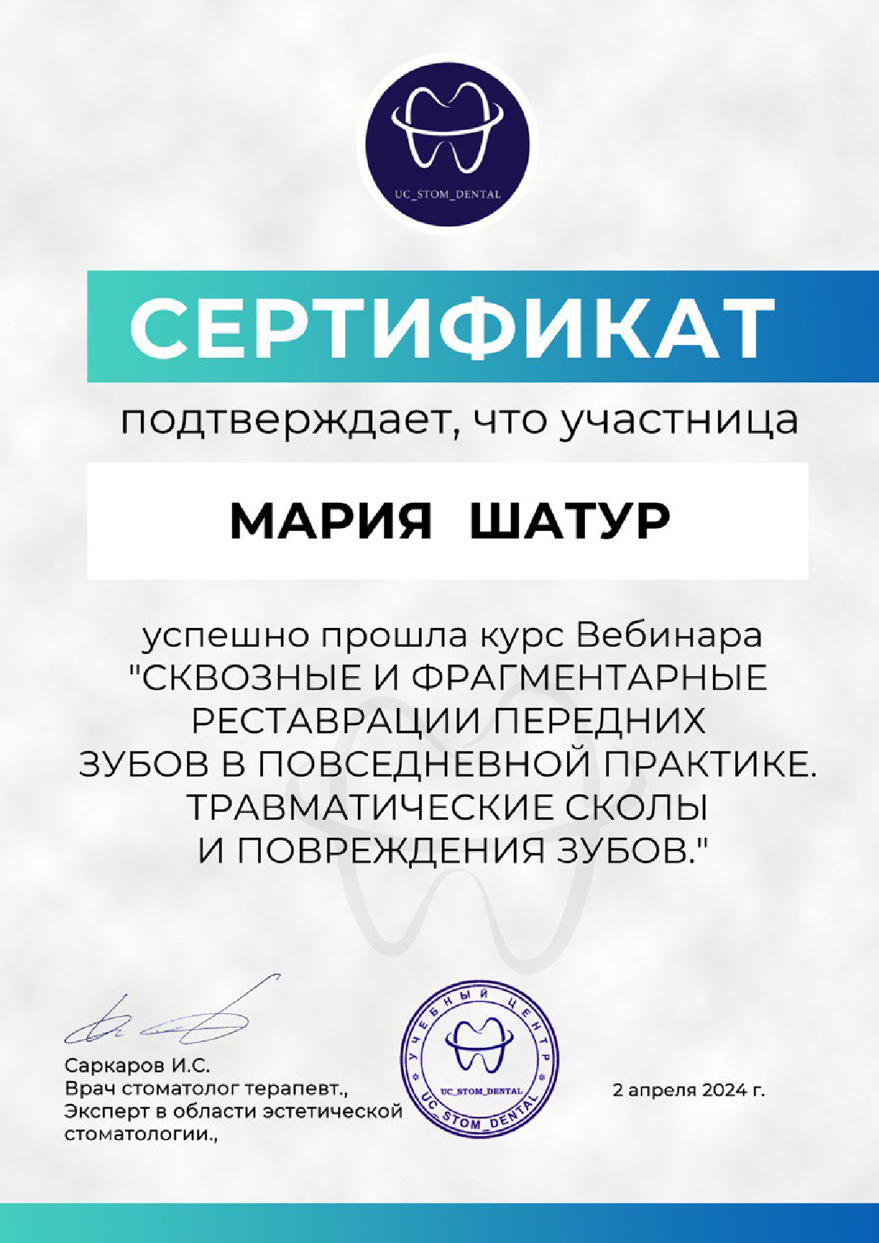- Саркаров И.С. Вебинар «Сквозные и фрагментарные реставрации передних зубов в повседневной практике. Травматические сколы и повреждения зубов», 2024