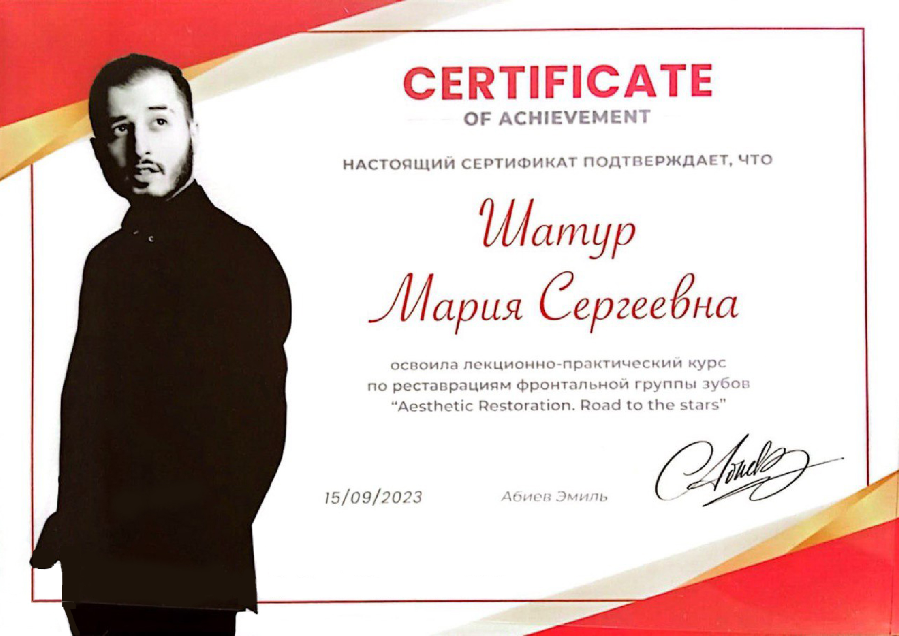 - Абиев Эмиль. Лекционно-практический курс по реставрациям фронтальной группы зубов «Aesthetic Restoration. Road to the stars»., 2023