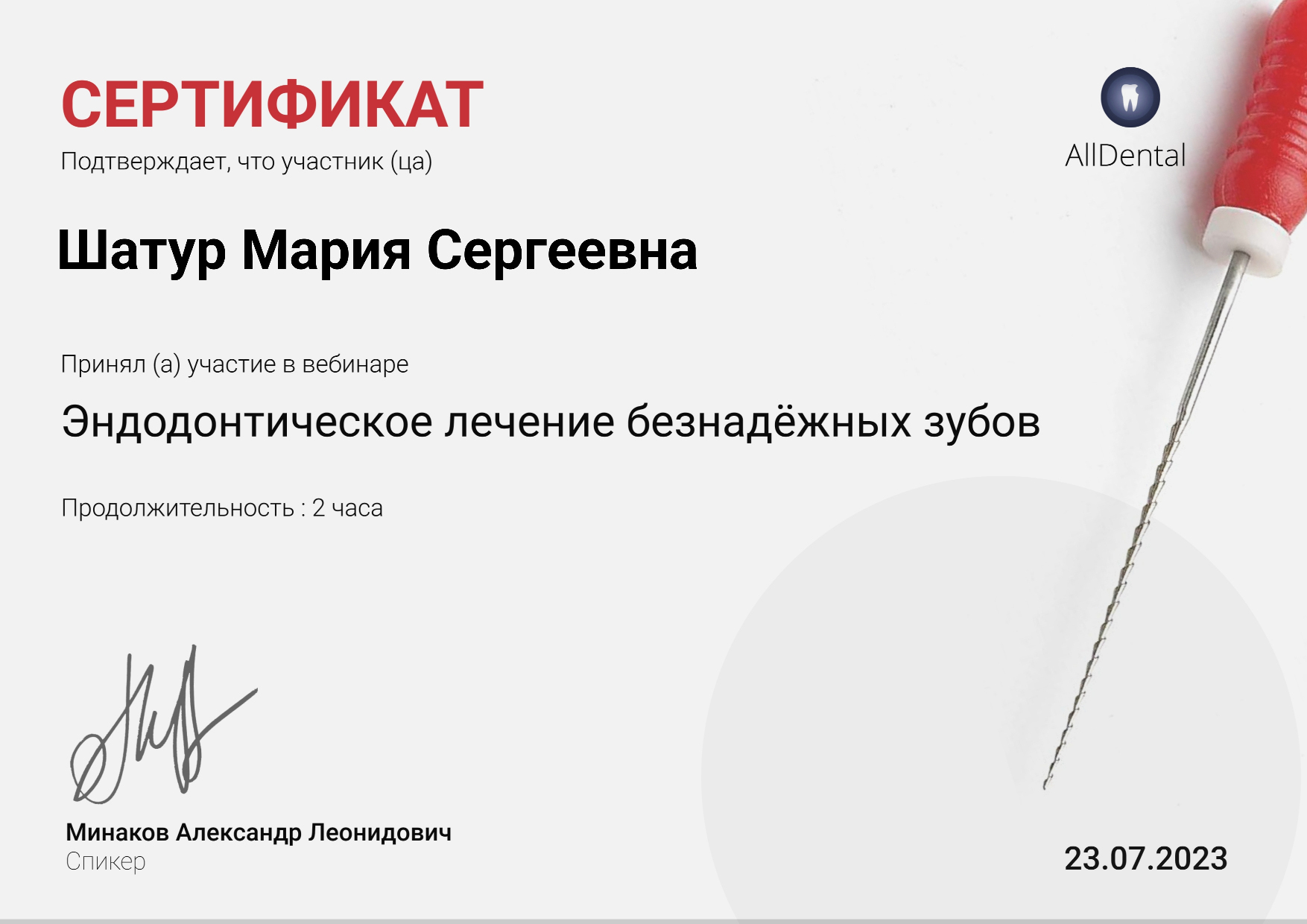 - Минаков А.Л. Вебинар «Эндодонтическое лечение безнадежных зубов», 2023