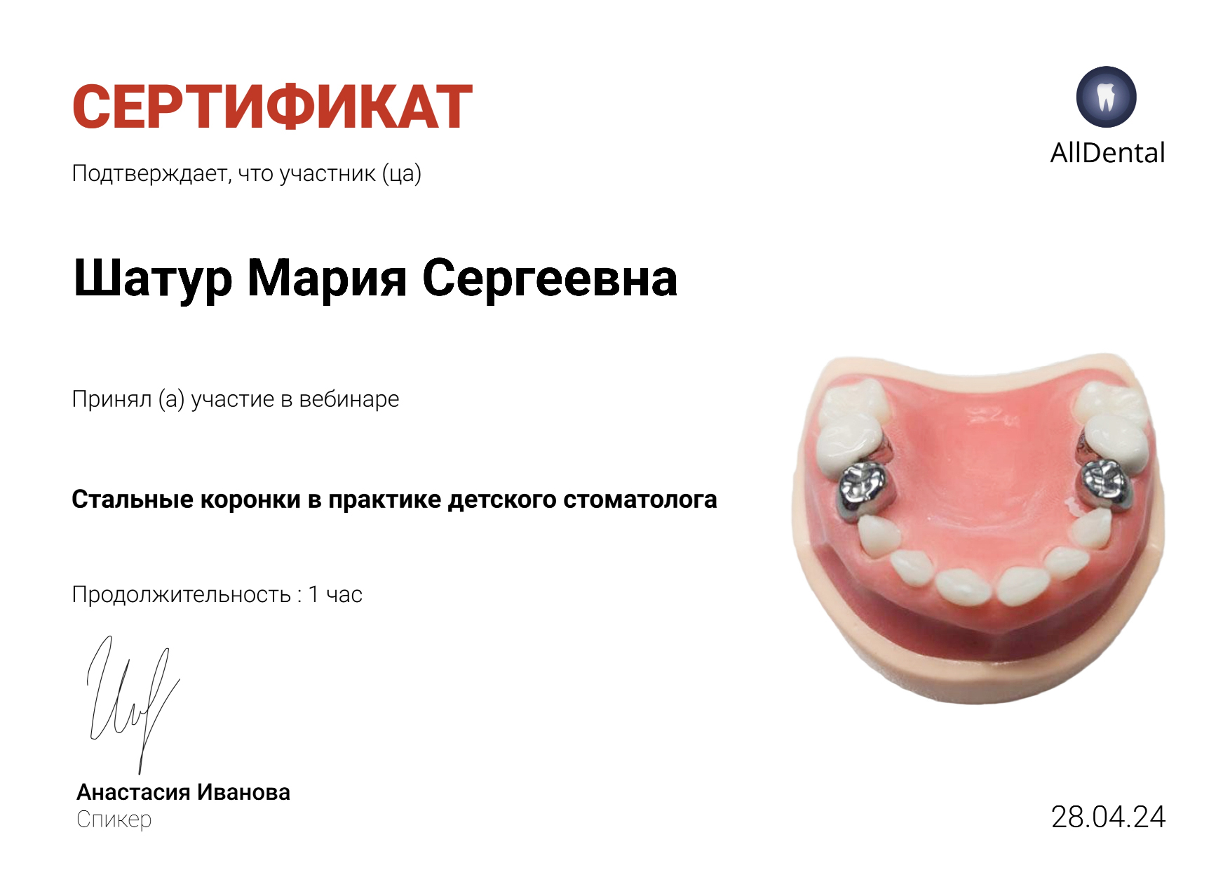 - Анастасия Иванова. Вебинар «Стальные коронки в практике детского стоматолога», 2024